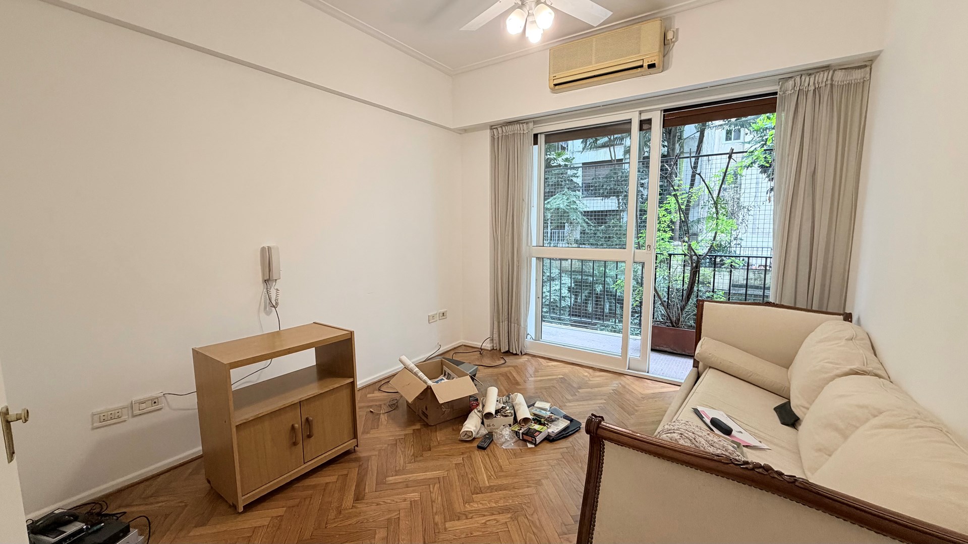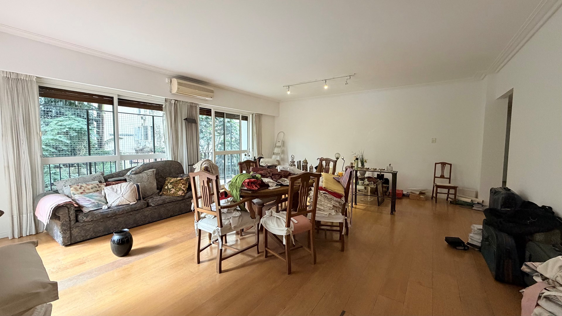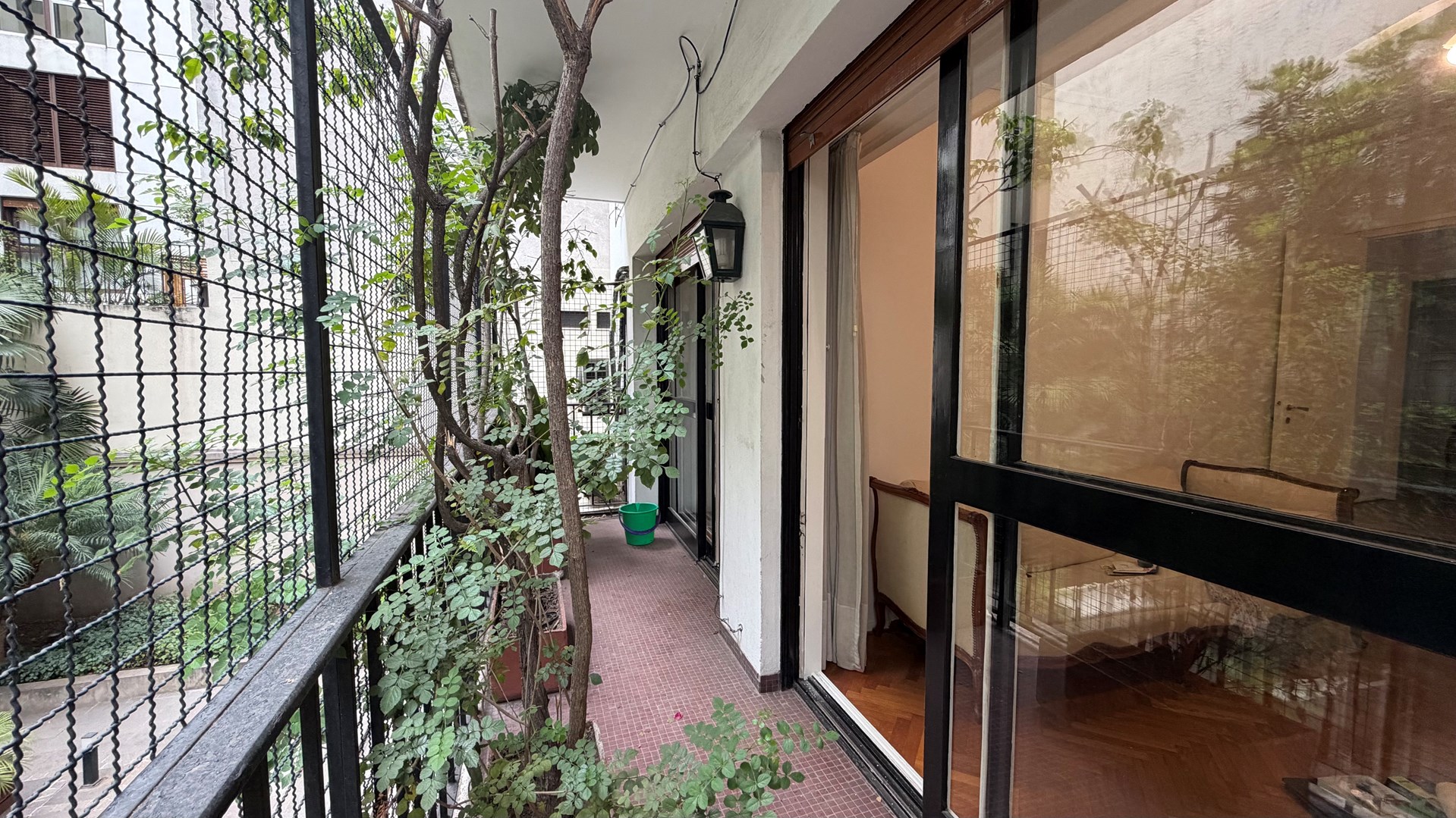 Amplio living comedor con salida a balcón y gran terraza con vista al jardín del edificio.
